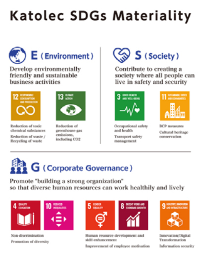 For example, in the Katolec Group, we have been contributing to the realization of a prosperous society by addressing social issues through our logistics and electronics (EMS) business. However, social issues on a global scale have become more serious in recent years, and efforts to address them are becoming increasingly important. Accordingly, we view the Sustainable Development Goals (SDGs) adopted by the United Nations in 2015 as an important objective to lead the world and subscribe to this vision. We further declare that we will proactively work toward the realization of a sustainable society through our business by pursuing economic value for our company while at the same time-solving social issues.