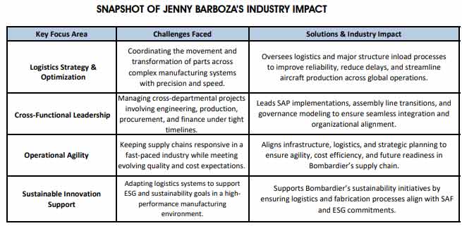 At Bombardier, Barboza’s approach to leadership is precise, collaborative and grounded in the belief that systems are only as strong as the people and processes behind them. She brings a unique ability to translate technical constraints into strategic opportunities—working closely with engineering, production, and logistics to build smarter, more resilient operations.