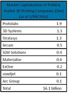 3D Printing is real. I have a figurine of myself sitting on my desk. I have a larger print of just my face as well. It’s kind of creepy. President Obama highlighted the technology in his 2013 State of the Union address. Walmart CEO, Doug McMillon, brought 3D printed figurines of his executive team to the company’s 2014 shareholders meeting. Amazon recently filed a patent for mobile 3D printing delivery trucks. What you may not know is that the market capitalization of publicly traded 3D printing companies exceeds the total size of the market.